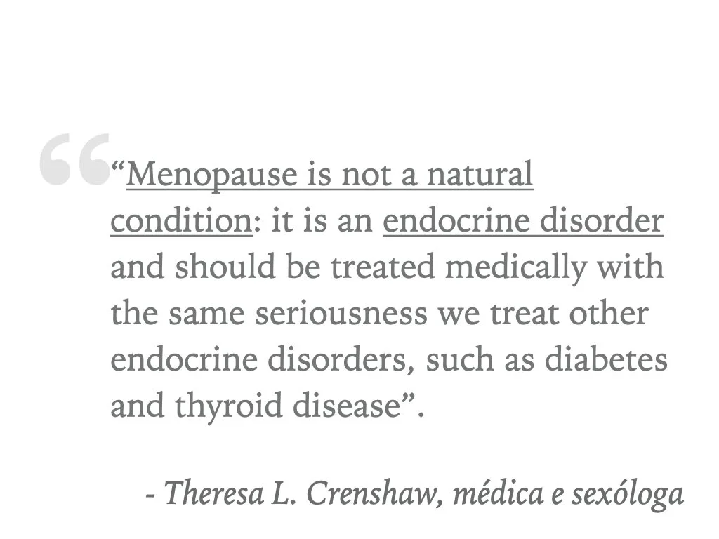 A ideia subjacente é que a menopausa é uma condição de deficiência de hormonas, que portanto devem ser repostas. Este ponto de vista está a voltar em auge inclusivamente em ambientes “alternativos” que pretendem enquadrar a menopausa numa óptica positiva.